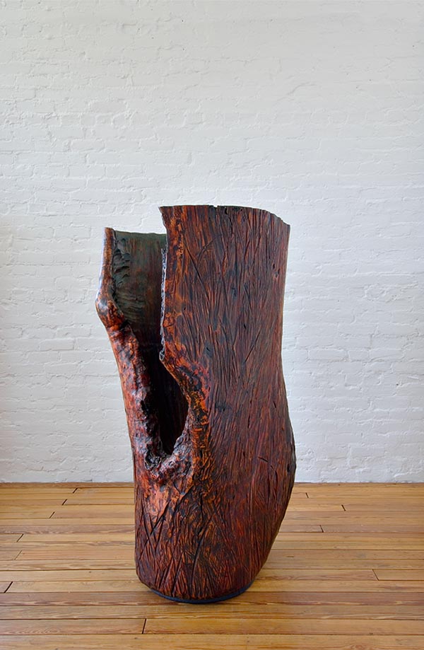 plays with the aesthetics of bent and contorted tree trunks, making cracks