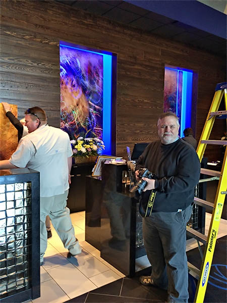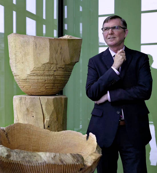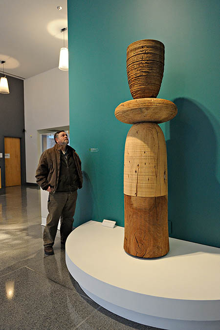 Allen Blevins poses with Mark Lindquist's Totemic Series