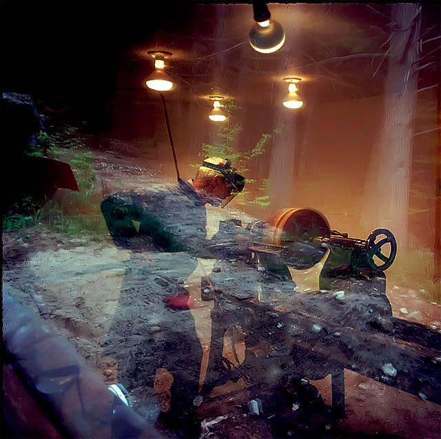 Shot from outside the studio, shows Melvin turning with stream and trees